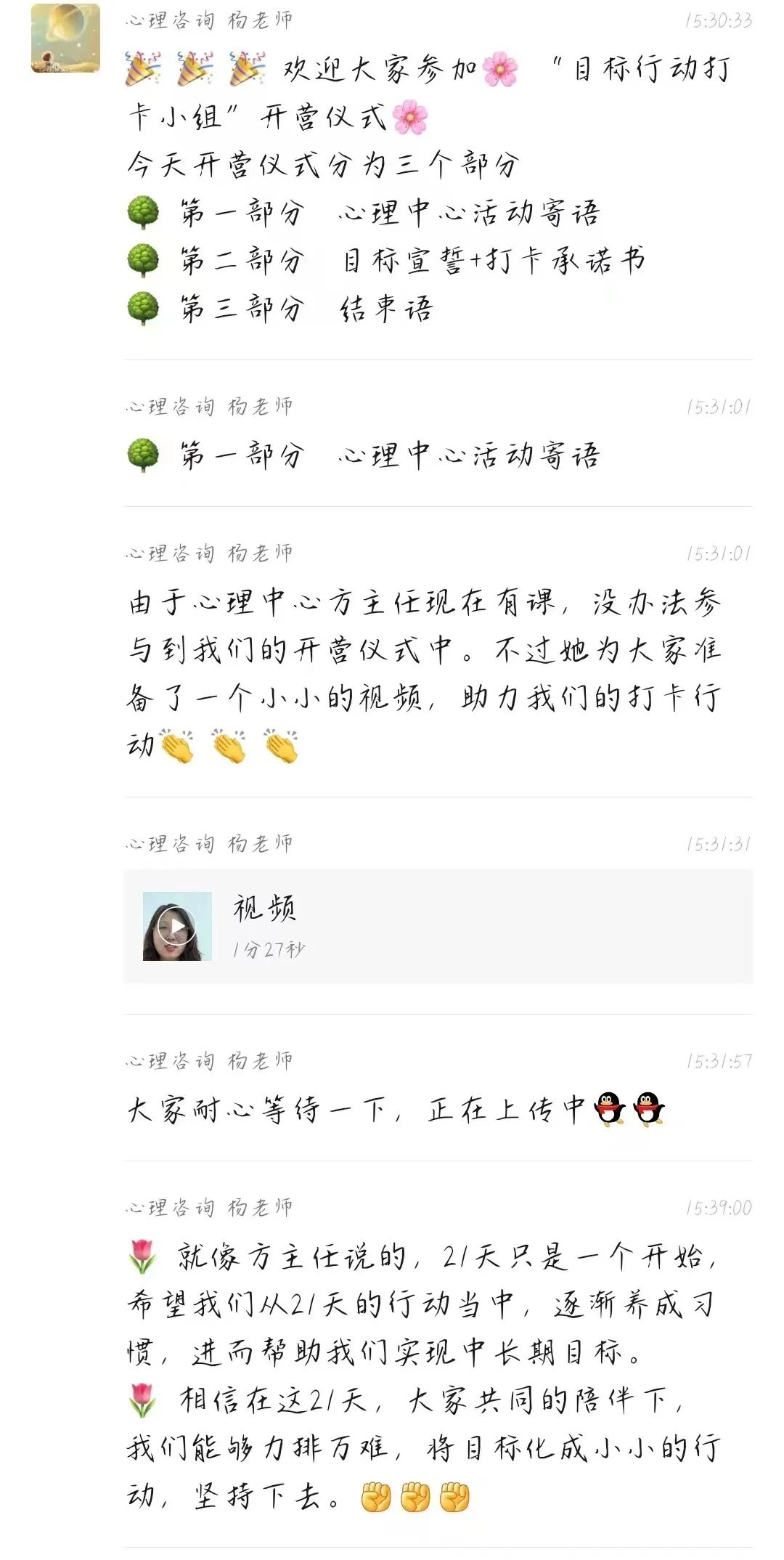 为了使同学们通过打卡来呈现自己思想,让他人了解自己、传达正能量、帮助同学们实现中长期目标。心理咨询与健康中心举办了目标行动小组活动,受到了老师们和同学们的积极支持,达到了预期的目的,现简要总结如下:4月8日下午仪式开始,心理咨询与健康中心方秀莲主任用准备的视频,寄语目标行动小组活动。方主任相信大家能够力排万难用21天将小小目标化成行动,坚持下去;接下来,同学们将自己的目标进行宣誓,并且进行打卡承诺,签上自己的名字;最后,心理中心杨老师送出寄语:“在我们一路行走的过程中,我们的脚下不仅会有走的很顺畅,很滑溜的时候,也一定会有遇到很多的坎坷和挫折,甚至摔跟头的时候,愿我们真诚的面对自己,一路同行,共同为了自己的那个小目标去奋斗。”