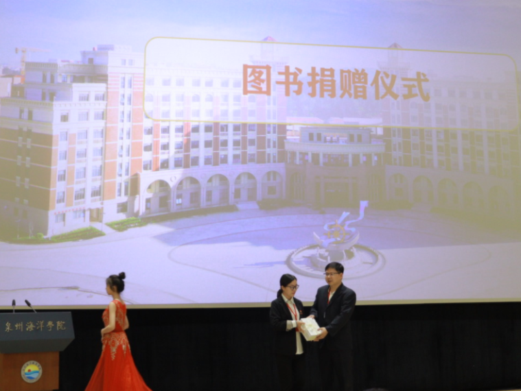 资助中心邱玉华主任代表泉州师范学院毛佳佳博士向图书馆赠书,林昭勇老师代表图书馆接受赠书。