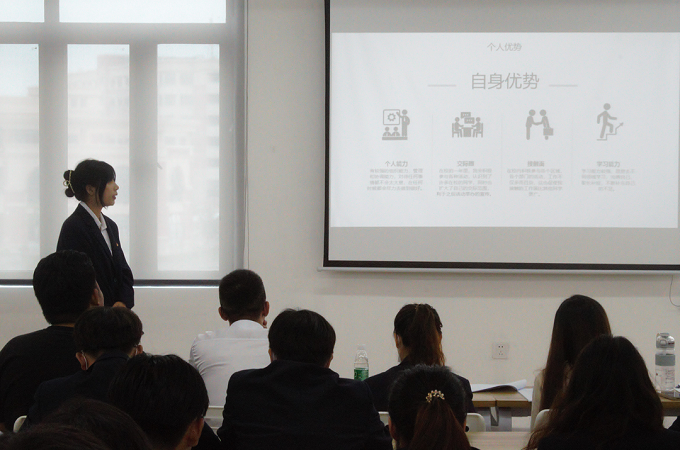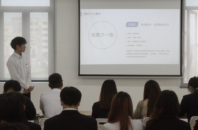 此次竞选采用上台演讲PPT和答辩的形式进行,每一位竞选者都着装整齐,精神饱满,他们上台分别从个人经历、竞选优势、自身优缺点、岗位认识和未来的规划进行讲述。尽管只有短短的几分钟,但他们准备充分,从容自信地展现了我校学子优良的风采。