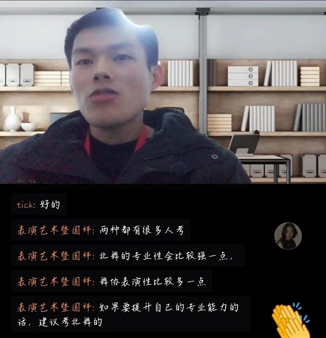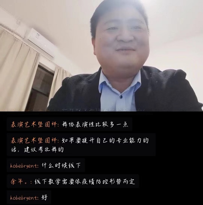 最后,艺术体育学院孙玉坤院长进行总结,他先是表扬了这次线上活动热闹的氛围,为同学们积极的提问和老师们真诚的回答点赞。并鼓励同学们要去期待自己的专业,不要模糊地对专业进行定位。同时院长教育同学们要树立正确的人生观、价值观,并建议大家在行业的探索与实习中,坚定自己的目标与初心。最后院长要大家珍惜师生情意,互怀感恩之心。并祝福大家平平安安,希望疫情封控早日结束,让大家一起在线下见面。