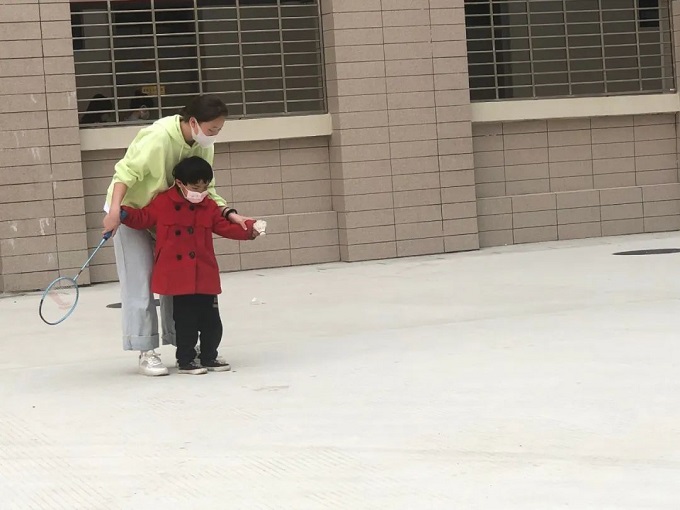 下午,艳艳正和关爱小组成员一起学习打羽毛球