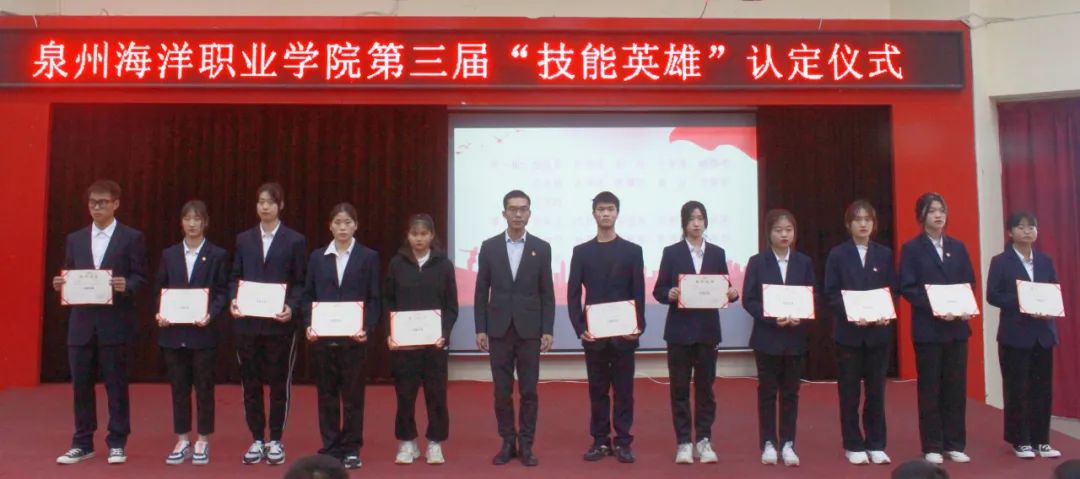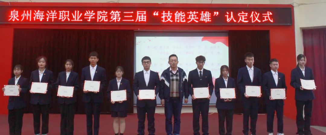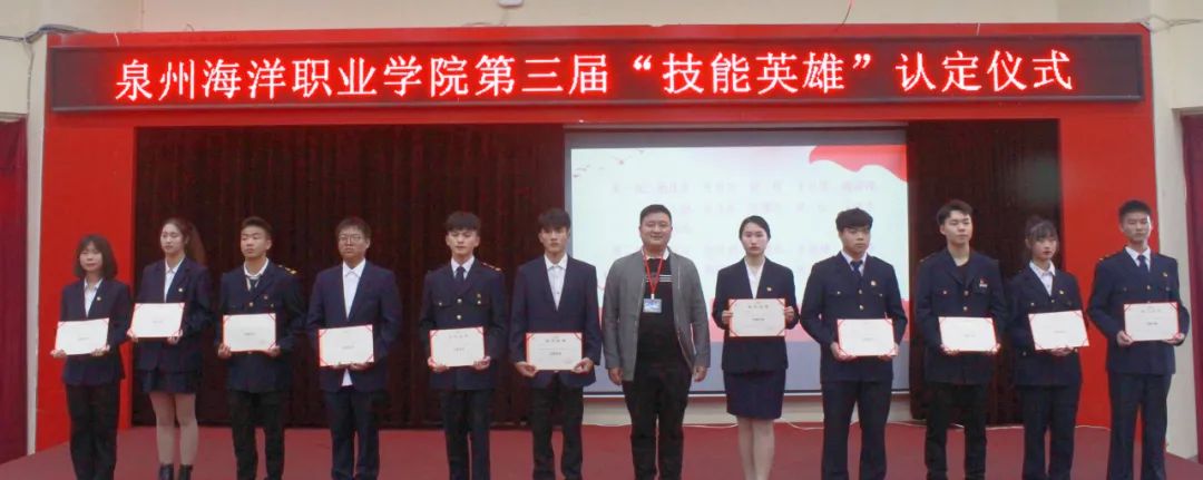 “拼技能精熟”是泉州海洋职业学院“333导向的三全育人模式”的重要组成部分。2019年5月,在校领导的提议下,学生工作与发展部牵头制定了《泉州海洋职业学院“技能英雄谱”实施方案》,并于2019年10月29日,举行了首届“技能英雄”的认定仪式,首期认定了50名在职业技能、文艺技能、体育技能、语言技能、游戏技能、社会实践技能、生活技能等方面具有突出代表性的同学入选“技能英雄谱”,2020年11月,第二批认定了101名“技能英雄”。技能英雄的认定营造了校园创先争优、比拼赶超的良好氛围,“技能英雄谱”的建立也得到了我校二轮评估专家组的充分肯定。时隔一年,我们再次评选出54名“技能英雄”。
