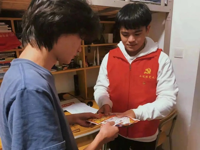 “别急,就是怕同学像你一样走得这么急忘记收衣服,回来的时候脏了、丢了,咱们党员队伍已经到宿舍帮大家收啦。”