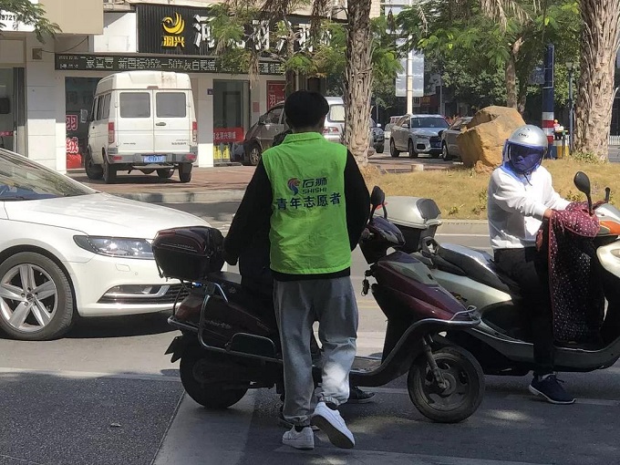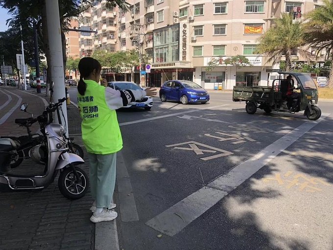 创城活动中,志愿者们配合交警在石狮市13个主要交通十字路口开展文明交通督导志愿活动。维护交通秩序,引导非机动车、行人按交通信号指示灯停走,对行人不走斑马线、行人及非机动车闯红灯、逆行等交通违法行为进行耐心劝阻,进行文明交通知识宣传,引导车辆、行人各行其道,文明出行,并对道路两旁停放无序、混乱的非机动车进行整理。在志愿者们的共同维护下,闯红灯、逆行等行人和非机动车的交通违法行为明显减少,路口通行秩序明显改善。