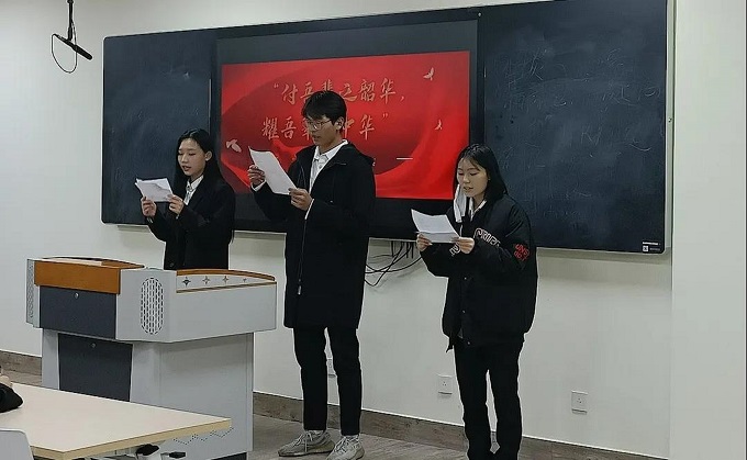 为了纪念了“一二·九”运动87周年,弘扬同学们的爱国主义精神,增强我校同学们的责任感,使命感以及集体荣誉感,展现当代大学生的朝气蓬勃,奋发进取的精神面貌。泉州海洋职业学院于2021年12月9日,晚上七点在行政楼智慧教室举行了以纪念“付吾辈之韶华,耀吾辈之中华”为主题的爱国朗诵比赛。
