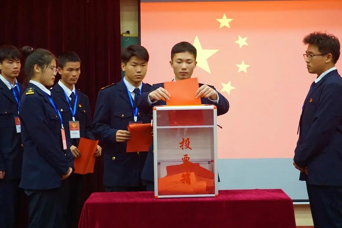 会议进入投票表决选举阶段,总监票人和监票人当众启封检查选票和投票箱,工作人员依次分发选票,代表们规范填写选票后按顺序排队进行投票。投票完毕后,由团员代表总计票人和计票人、学生代表总计票人和计票人分别对选票结果进行统计。大会本着民主、公开、公正的原则,40位团员代表、60位学生代表采用无记名投票的方式选举新一届团委会委员、学生会主席团成员。