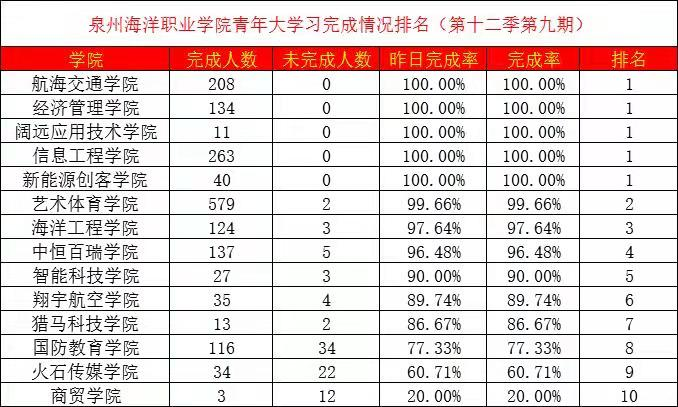 学习新思想,争做新青年!青年大学习第十二季第九期的团课学习已经圆满结束啦!团团发现大家不仅没有懈怠对青年大的学习,希望同学们继续努力哦。让我们看一下各学院的参学率吧!
