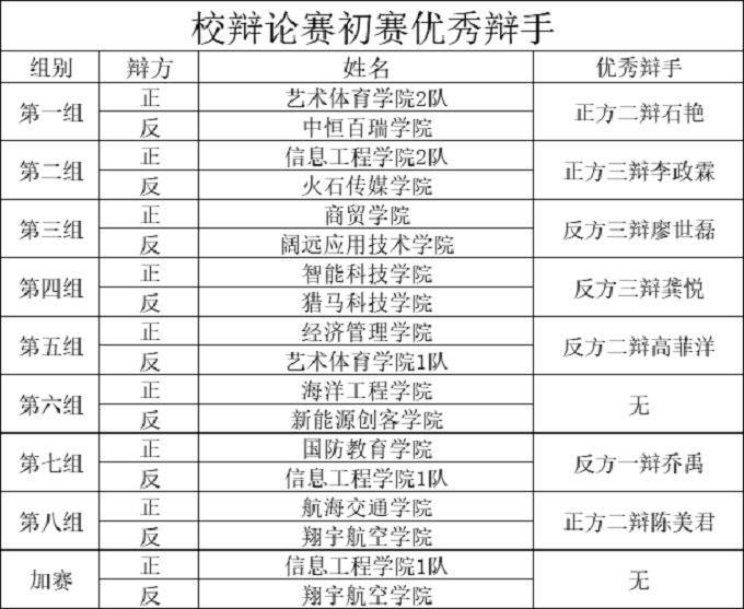 本次辩论赛,挖掘出了一批具有灵活应变能力、优秀的语言组织能力和团队协作精神的同学。同时,也涌现了一批具有高素质,口才犀利,思维敏捷的优秀辩手。感谢他们为我们带来了精彩绝伦的比赛。