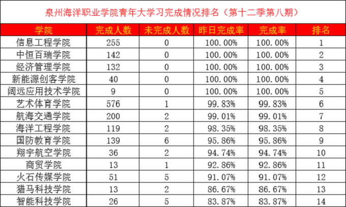 在此对、信息工程学院、中恒百瑞学院、经济管理学院、新能源创客学院、阔远应用技术学院的青年大学习提出表扬!完成率高达100%。艺术体育学院、航海交通学院、海洋工程学院、国防教育学院、翔宇航空学院、商贸学院、火石传媒学院、猎马科技学院、智能科技学院要 续加油哦!
