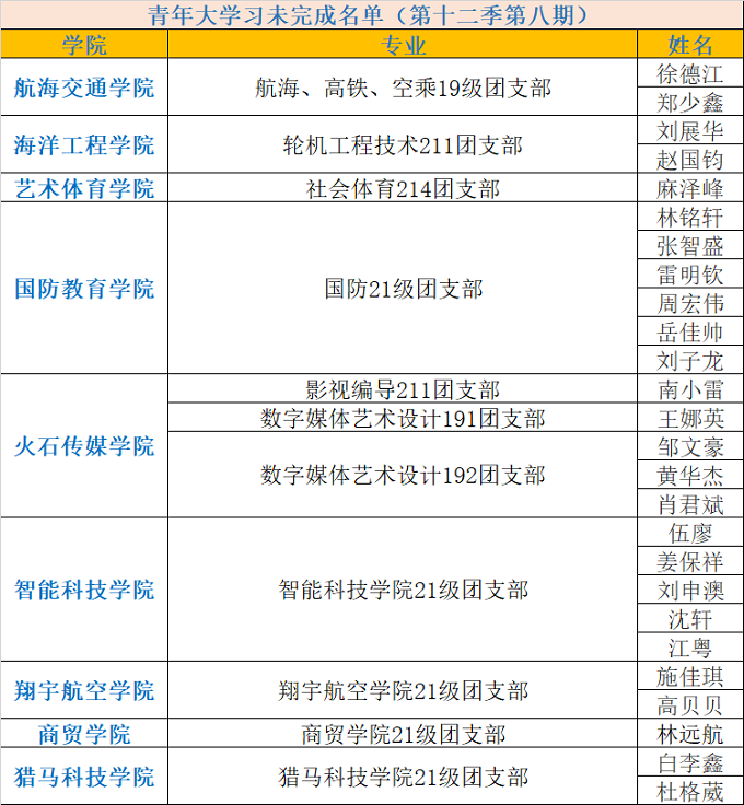 请航海交通学院、海洋工程学院、艺术体育学院、国防教育学院、火石传媒学院、智能科技学院、翔宇航空学院、商贸学院、猎马科技学院的这些同学以后多注意团课学习哦!