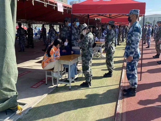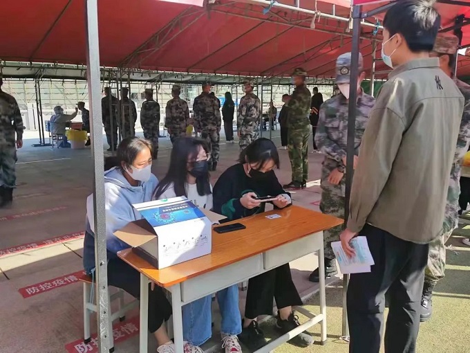 志愿者们在接受现场医务人员的指导后,有序地帮助师生们扫码进行信息登记、信息核对、测量体温。护卫队引导师生保持在安全距离,有序地进行核酸检测,对同学们的疑问进行耐心地解答。