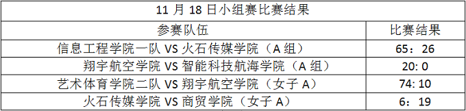 在11月18日的篮球赛中,信息工程学院一队、翔宇航空学院、艺术体育学院二队、商贸学院成功赢下比赛。