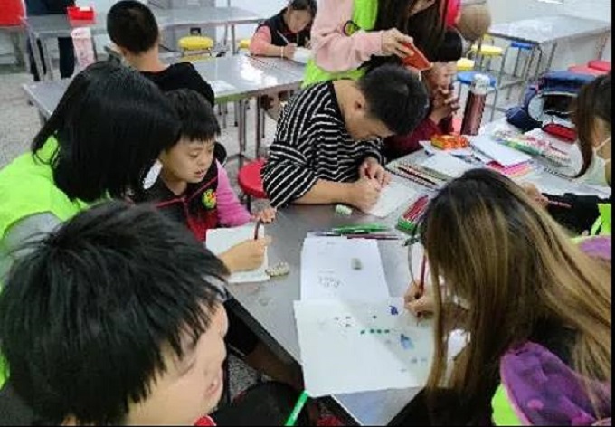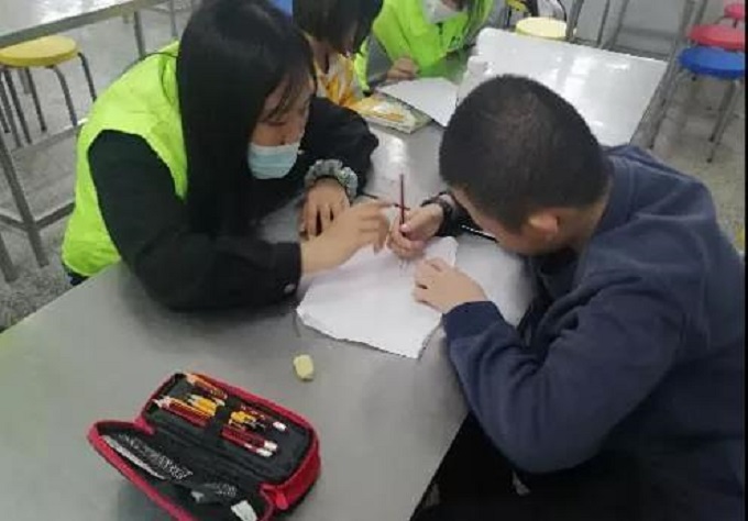 志愿者与特教老师进行沟通,了解与特殊儿童相处需要注意的事项后,开始陪伴孩子们写作业、画画、打篮球。经过短暂的相处,志愿者们走进孩子们的内心世界,聆听他们的心声。