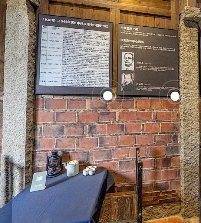 旧址内,门口的左手边立着一块告示牌,上面记录着中共泉州中心县委革命大事记,右边记载着中共泉州中心县委机关旧址的简介。内部由大大小小11间房间组成,每间房间墙上都有着注解。