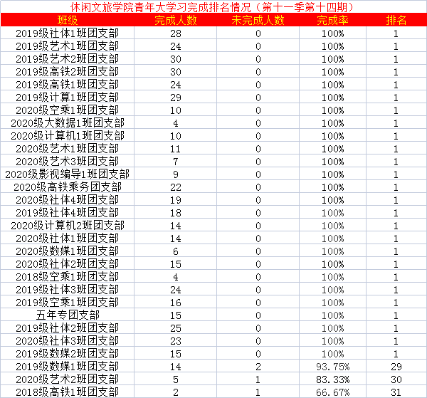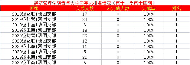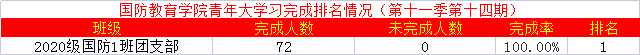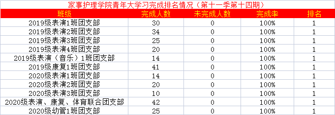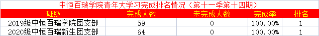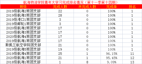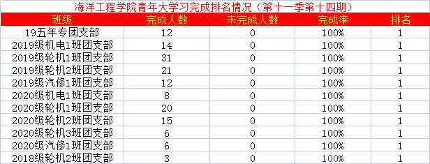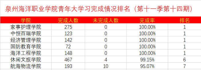 在此对家事护理学院、中恒百瑞学院、经济管理学院、国防教育学院、海洋工程学院的青年大学习提出表扬!完成率高达100%,当然其他学院也不要灰心,要继续加油哦!