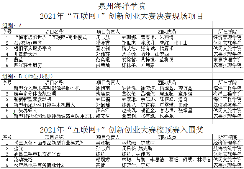 我校举办的2021年“筑梦泉海”“互联网+”创新创业大赛初赛与复赛已落下帷幕。经过学院初赛、校复赛审核,最终从全校参赛项目中选拔12项优质项目进入校决赛,同时评选5个优秀项目获得校预赛入围奖,如下表所示: