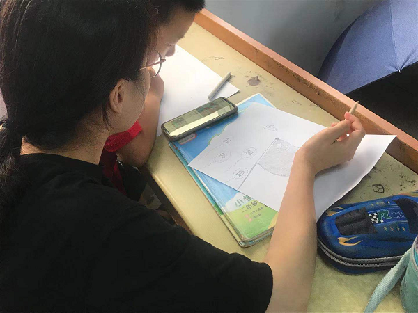 帮学结束后,学生会代表在讲台上讲述党和祖国的历史,并提出此次绘画活动的要求以及注意事项。小朋友们都踊跃参加,与大学生共同绘画心目中的祖国,爱国心和想象力在此刻一同激发,一幅幅栩栩如生的画作完成了。