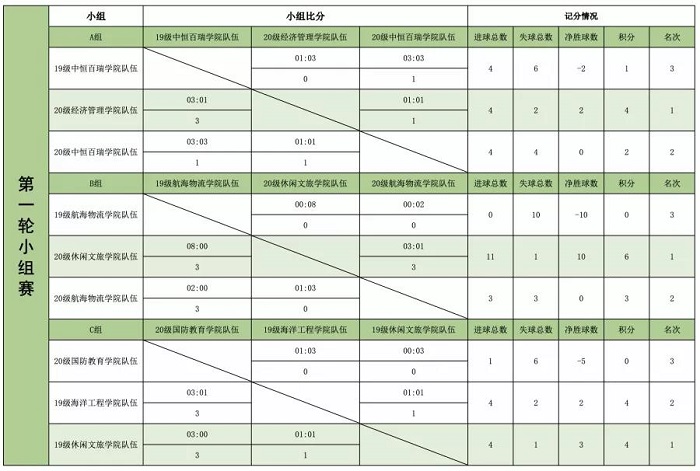 足球在绿茵场上频频飞舞,划出一道道弧线,在奔跑、技巧和力量的角逐中,展现了我校学子良好的身体素质,以拼搏之风采,不负青春之热爱。截止至11月6日,第一轮小组赛落下帷幕,三支球队从小组赛胜出!