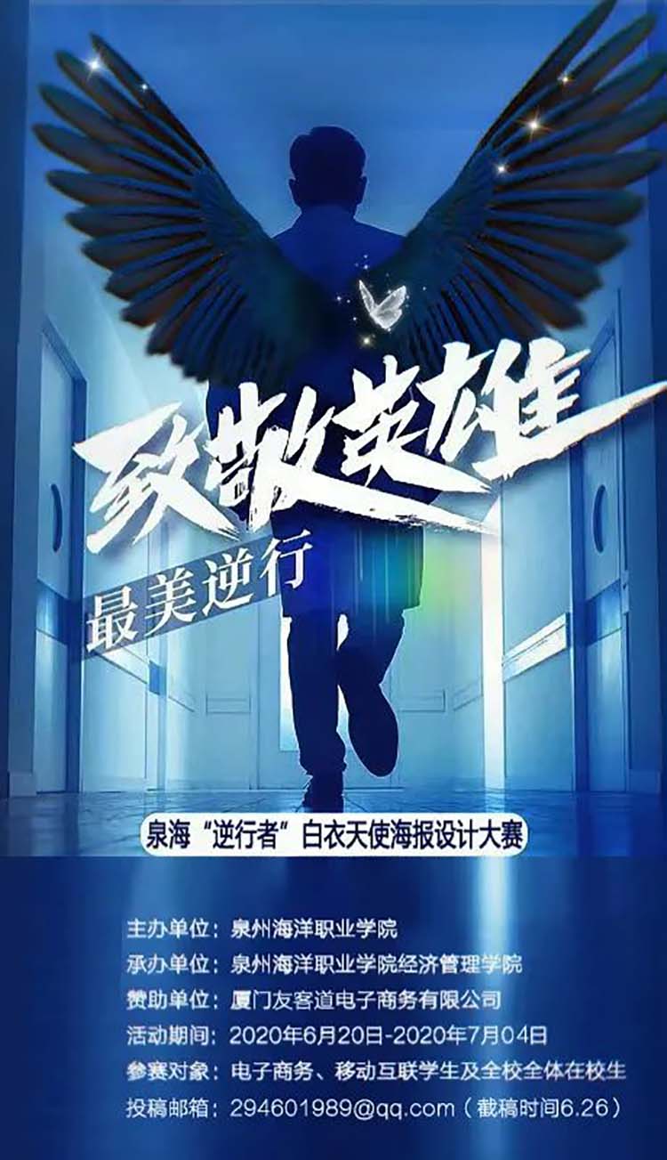 3.参赛个人或团队应于2020年06月26日前提交一张设计完整的海报发至294601989@qq.com邮箱(注明名字学号班级)供收集评审;评审结果将于2020年07月04日公布。