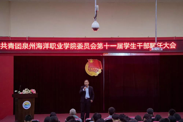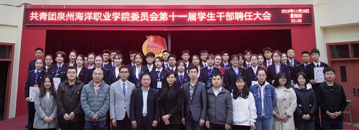 2019年11月28日晚9时,泉州海洋学院第十一届团学干部聘任仪式在2204报告厅隆重举行。莅临本次大会的领导嘉宾有:家事护理学院党支部书记陈经义老师、海洋工程学院党支部书记吴丽娇老师、机关党支部书记周甜老师、航洋物流学院党支部书记魏荣根老师、通实教育学院党支部书记林小城老师、经济管理学院党支部书记吴志雄老师、休闲文旅学院党支部书记陈合喜老师以及各位班主任老师。