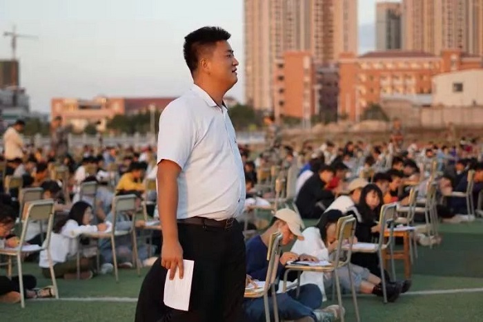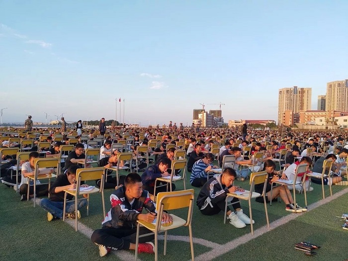 大一新生在各教官的组织下,将椅子和考试用具有序整齐地安置好后盘坐在操场静待考试指令。