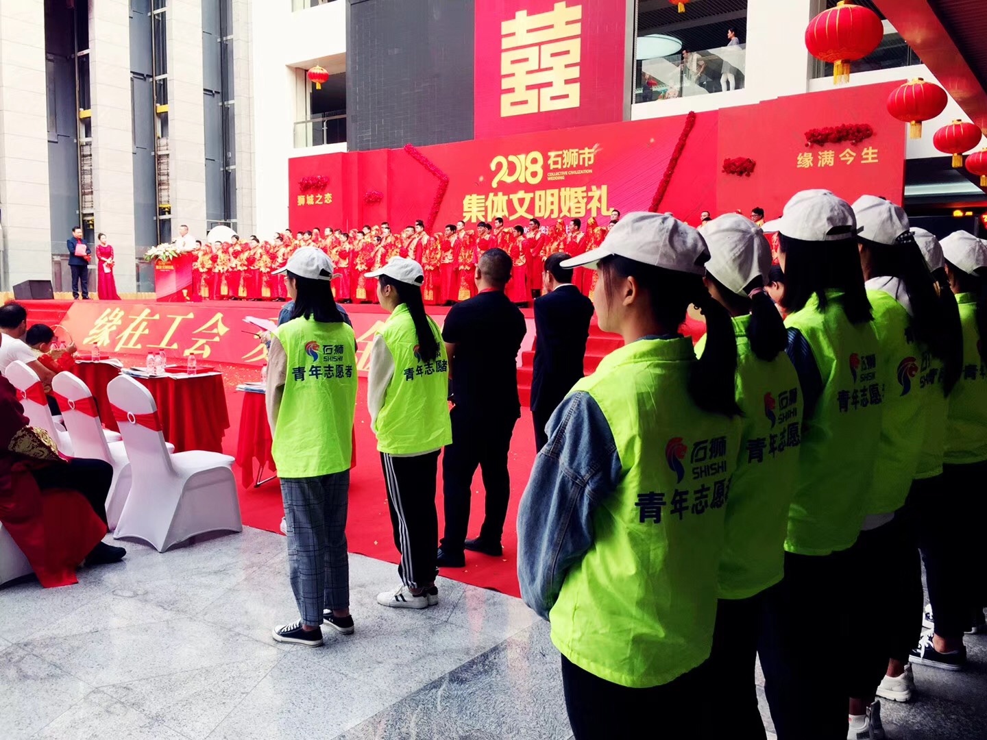 我们志愿者们主要的工作内容是负责维护场上秩序、协助会场活动的顺利进行,工作虽然充满艰辛和汗水,但是他们仍然以自己满腔的热血和积极的态度活跃在会场的每个角落,传递着满满的正能量,受到了广泛好评。伴随着婚礼进行曲,53位新娘手捧着鲜花,手挽着新郎缓缓走过红地毯,登上舞台,接受在场领导、嘉宾、亲朋好友的祝福。53对新人在市领导的证婚下,步入了神圣的婚姻殿堂,缔结了美好的姻缘。