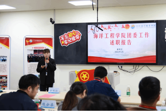 为落实团中央关于“全面大抓基层”重要导向,聚焦巩固和发展“三力一度两保证”的共青团工作格局。泉州海洋职业学院2023年基层团组织众评众议述职于5月9日在智慧教室隆重召开。泉州海洋职业学院党委副书记、副校长李明灿,学工部部长张君,校团委书记、学工部副部长屈先锋出席本次大会,同时担任述职评议的还有学工部思政科科长,二级学院的党支部副书记,二级学院学工负责人,以及来自校、院两级主要学生骨干,共计50余人。