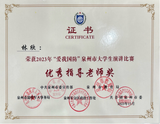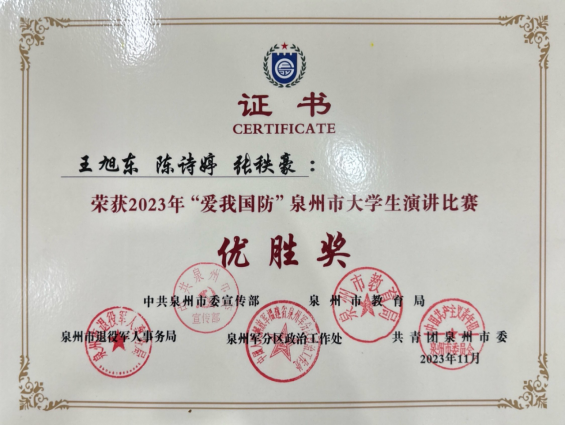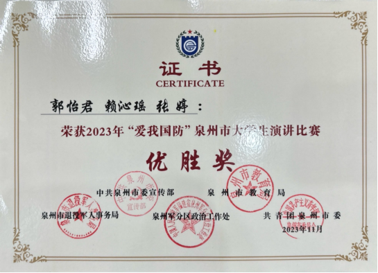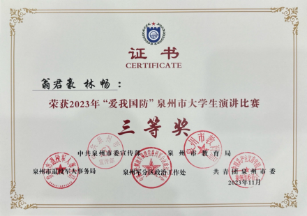 由中共泉州市委宣传部、泉州市教育局、泉州市退役军人事务局、泉州军分区政治工作处和共青团泉州市委联合主办的2023年“爱我国防”泉州市大学生演讲比赛中。由我校团委指导的大学生语言文化协会翁君豪、林畅两位同学组合在决赛中以优异的表现荣获三等奖,郭怡君、赖沁瑶、张婷、王旭东、陈诗婷、张秩豪六位同学荣获优胜奖。校团委林欣获得“优秀指导老师”称号,学校荣获“优秀组织奖”。