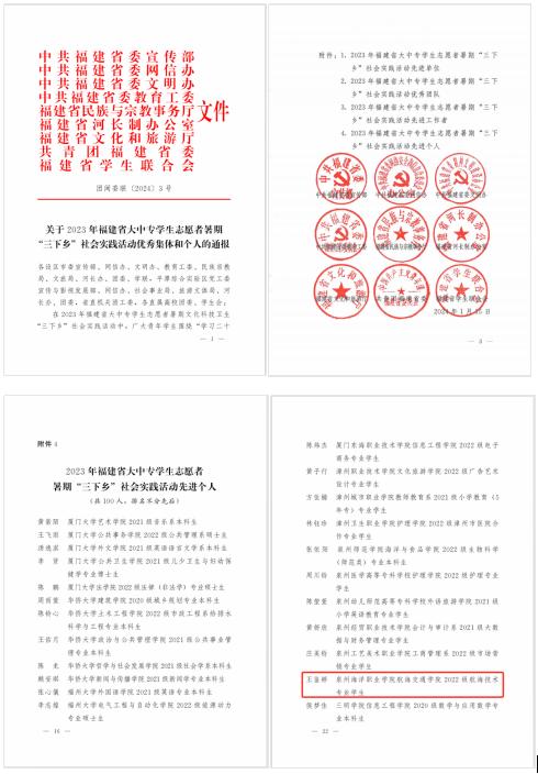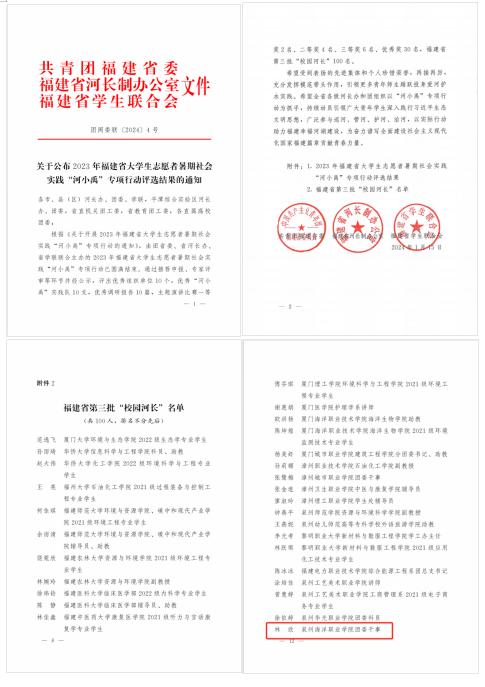 近日,中共福建省委宣传部、共团福建省委等部门联合印发了《关于2023年福建省大中专学生志愿者暑期“三下乡”社会实践活动优秀集体和个人的通报》《关于公布2023年福建省大学生志愿者暑期社会实践“河小禹”专项行动评选结果的通知》,通报表扬在2023年福建省大中专学生志愿者暑期“三下乡”社会实践系列活动中表现突出的集体和个人。我校校团委林欣老师被聘为福建省第三批“校园河长”。2022 级航海技术专业王鉴婷同学荣获2023年福建省“三下乡”社会实践先进个人。