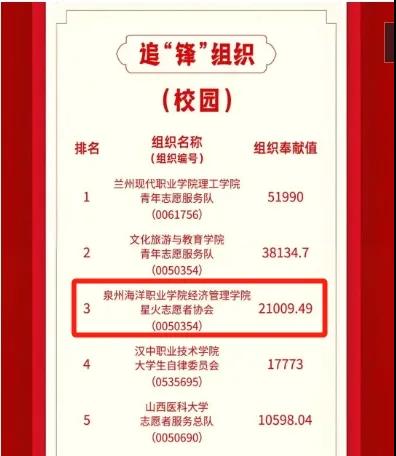 近日,在志愿汇2024“3.5学雷锋”全国联动活动中,我校经济管理学院星火志愿者协会荣获全国追“锋”(校园)第3名,大学生自律委员会荣获全国追“锋”(校园)第23名的好成绩。