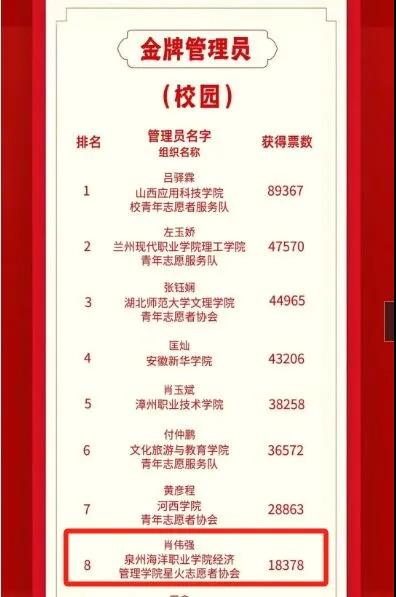 我校经济管理学院星火志愿者协会肖伟强荣获全国金牌管理员(校园)第八名的好成绩。