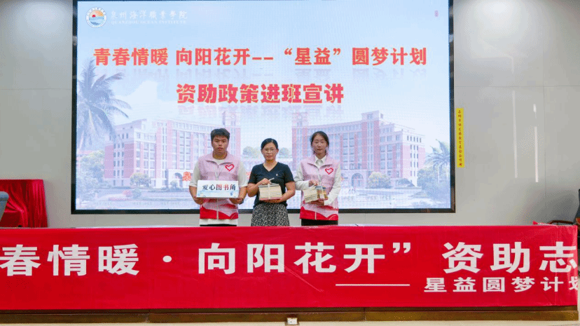 “星益”圆梦服务队成员在泉州海洋职业学院党委学生工作部办公室副主任林淑婷与资助与捐赠中心副主任温宝林老师的带领下,进行“星益”圆梦计划资助政策进班宣讲。为确保不让一个学生因贫失学,通过资助宣讲,让家庭经济困难的学生了解政策,通过学生资助政策得到帮助,熟悉如何利用资助政策,解除学习成长中的后顾之忧。同时,设立微心愿活动,去倾听学生心愿,完成他们所需,小小微心愿,浓浓深情谊。
