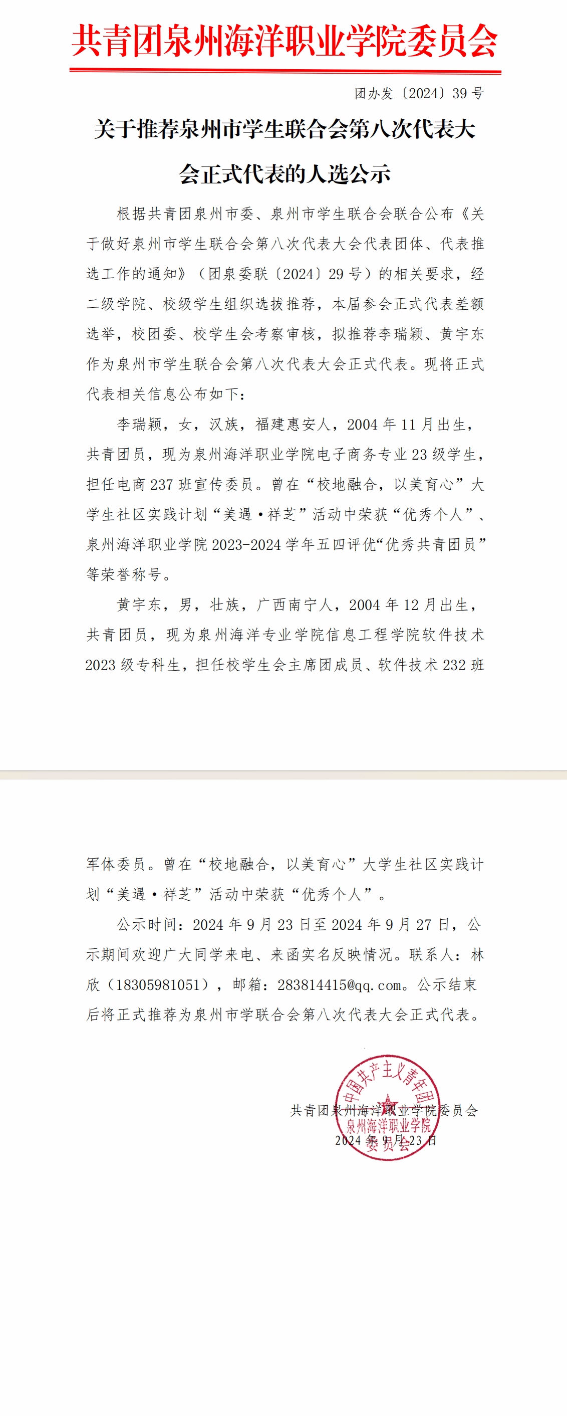 关于推荐泉州市学生联合会第八次代表大会正式代表的人选公示