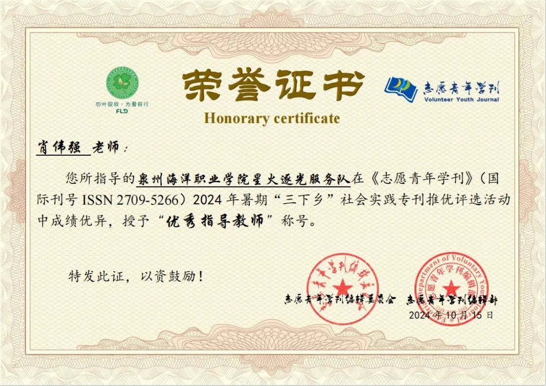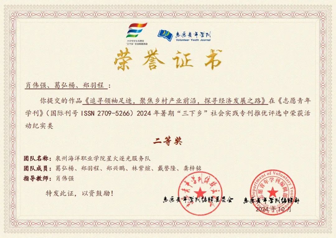 近日,《志愿青年学刊》2024年暑期“三下乡”社会实践专刊评优结果出炉,我校“星火逐光”服务队提交的作品《追寻领袖足迹,聚焦乡村产业前沿,探寻经济发展之路》荣获活动纪实类二等奖,肖伟强老师被授予“优秀指导教师”称号。
