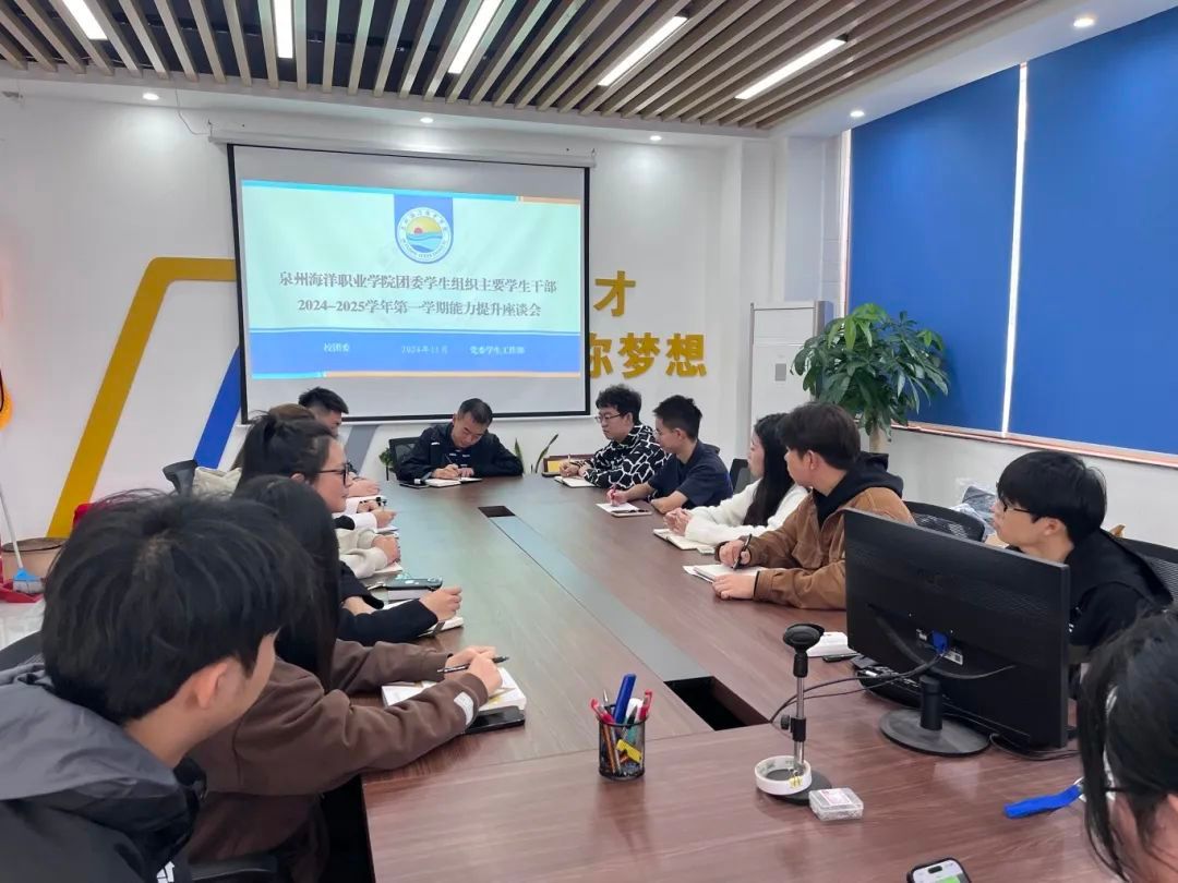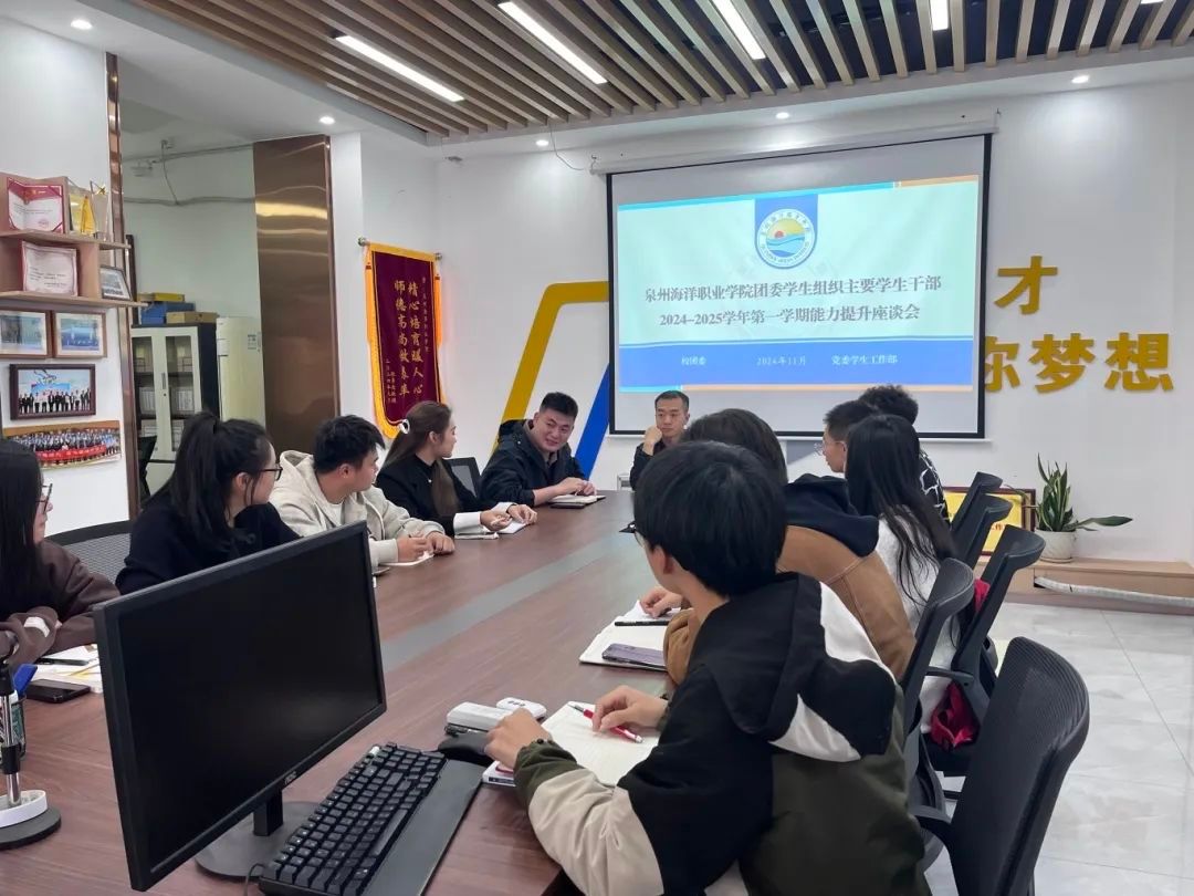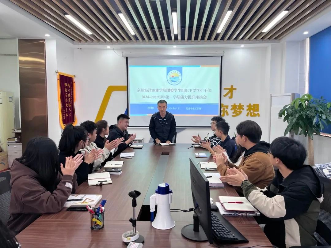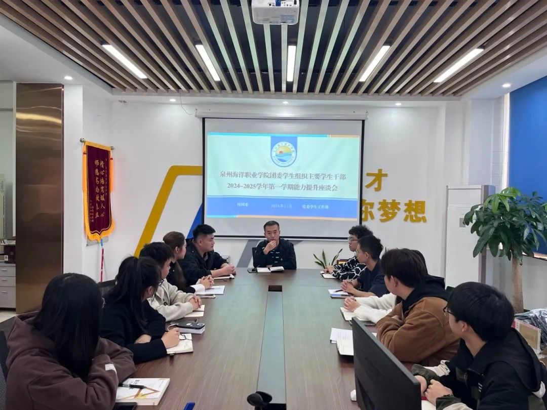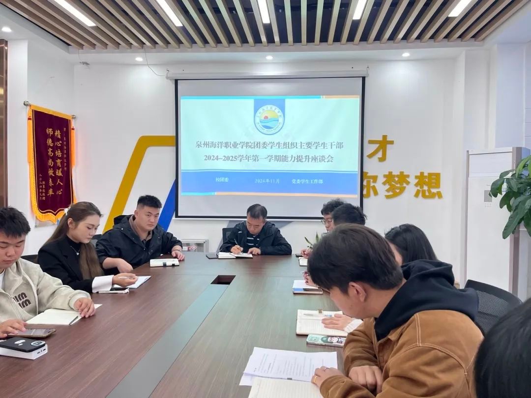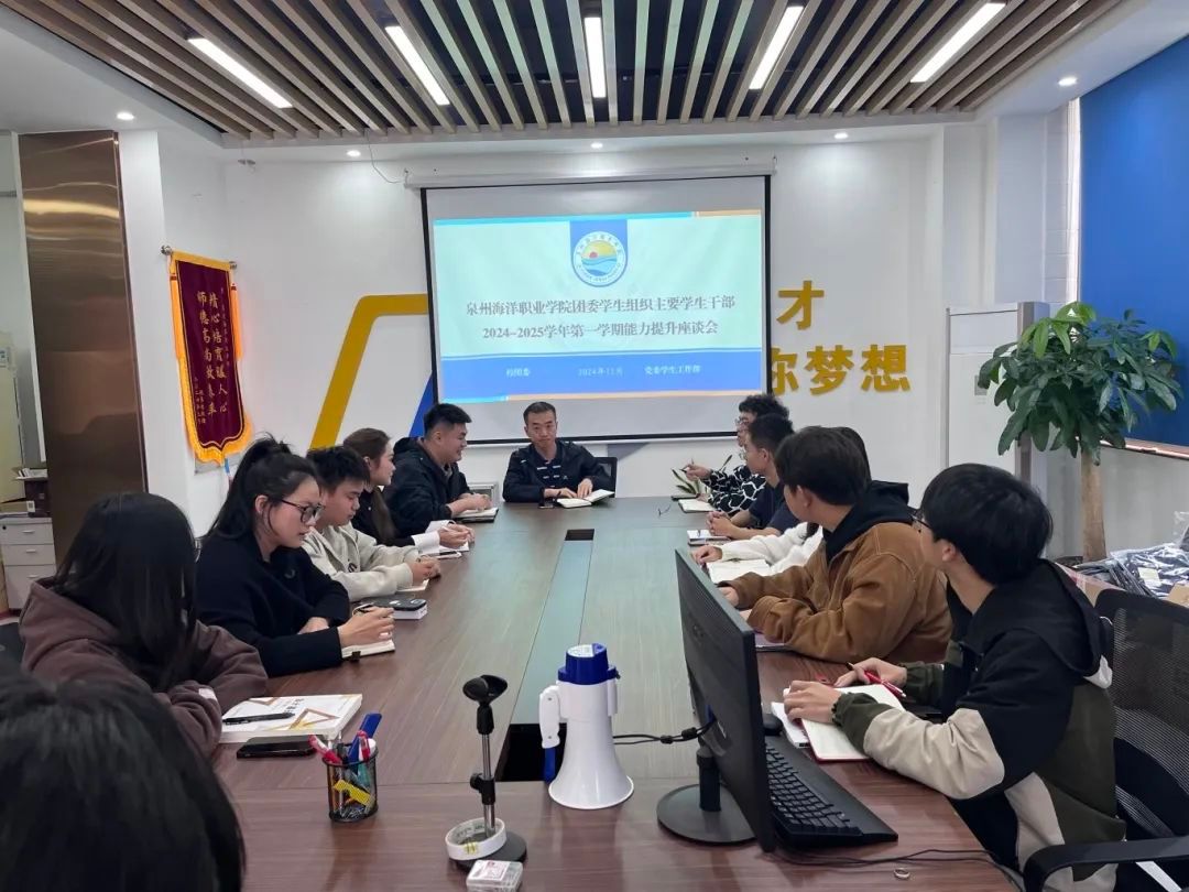 为更好地凝聚泉海青年力量、加强校团学组织建设、增强团学干部的服务意识和工作能力,2024年11月20日,校团委召开2024-2025学年第一学期学生团学骨干座谈会。党委学工部副部长、校团委书记余斐虎、校团委副书记肖伟强、校团委曲天一老师及各校级团学组织主要负责人出席本次会议。
