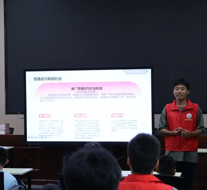 在推普教育环节,实践队员以普通话教学为载体,结合多媒体资源,通过寓教于乐的形式开展特色语言教学活动。其中,“绕口令挑战” 成为核心环节,孩子们专注练习“四是四,十是十”等发音,童音清脆、互动热烈,现场氛围活跃。队员们以趣味引导强化互动,通过绕口令、自我介绍等语言游戏充分调动参与热情,既在轻松氛围中提升了孩子们的普通话水平,也生动阐释了普通话作为全国通用语言的重要性。这种教学形式不仅深化了孩子们对讲好普通话的认知与重视,更切实达成了规范语言文字运用的预期目标。