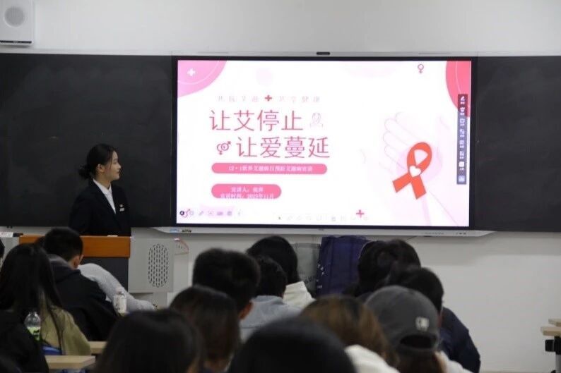 活动伊始,红十字会副会长侯萍率先开讲。她从艾滋病起源切入,清晰拆解血液、性、母婴三大核心传播途径,同时剖析发病机制,分享主流抗病毒治疗手段与“切断传播途径、提升防护意识”等实用防艾方法。她强调:艾滋病防治不仅是医学课题,更是关乎每个人健康的社会责任,让健康防护的意识稳稳扎根于在场同学心中。