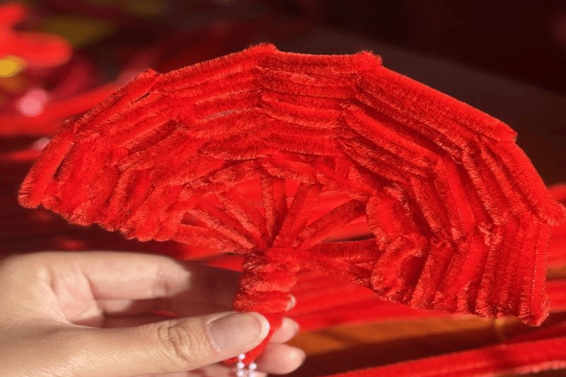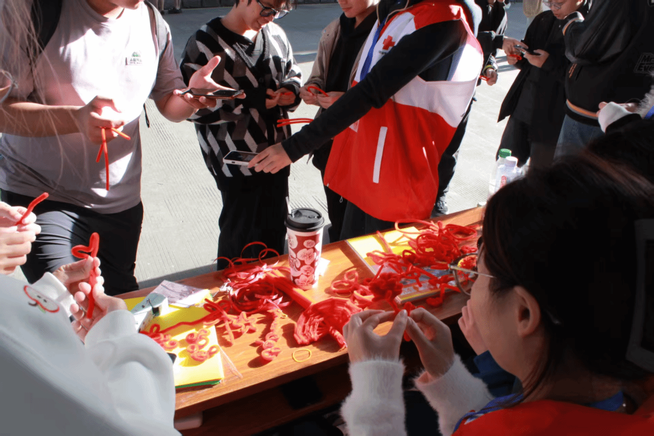动手创作啦!志愿者们和同学们默契配合,指尖翻飞间,红色扭扭棒渐渐变出各种造型。大家都全神贯注地打磨自己的作品,不一会儿桌上就摆满了各色小挂饰,每一件都带着独一无二的巧思~