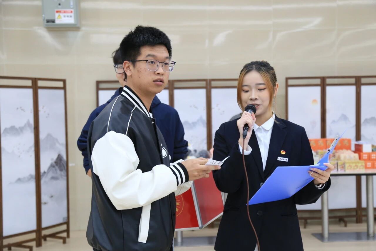 最令人期待的抽奖环节将活动氛围推向高潮。本次活动设置了一、二、三等奖,惊喜连连。三等奖由心理发展指导中心代微老师抽取,二等奖由党委学生工作部学生社区(公寓)管理科副科长陈书军老师抽取,一等奖则由党委学生工作部副部长、校团委书记余斐虎老师抽取。随着一个个幸运号码的诞生,现场欢呼声此起彼伏,中奖的学生干部激动不已,未中奖的同学也纷纷送上真挚的祝福,活动现场洋溢着温馨与欢乐。
