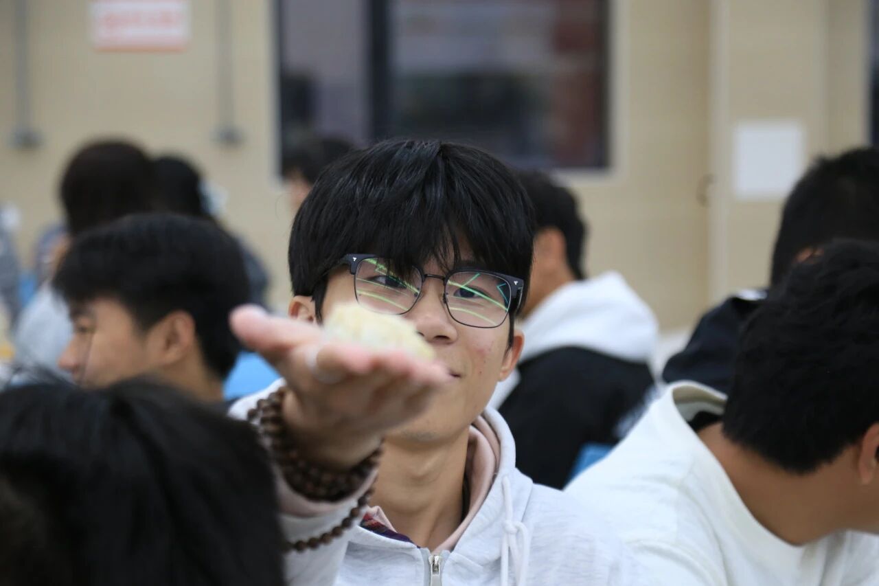 活动伊始,党委学生工作部老师与学生干部们齐聚一堂,共同参与包饺子环节。揉面、擀皮、填馅、捏合,大家分工明确、配合默契,一双双巧手翻飞,将一张张普通的饺子皮变成形态各异的饺子。老师们耐心细致地传授包饺子的技巧,同学们虚心学习、互帮互助,现场欢声笑语不断,每一个饱满的饺子都承载着师生同心的温暖与祝福。