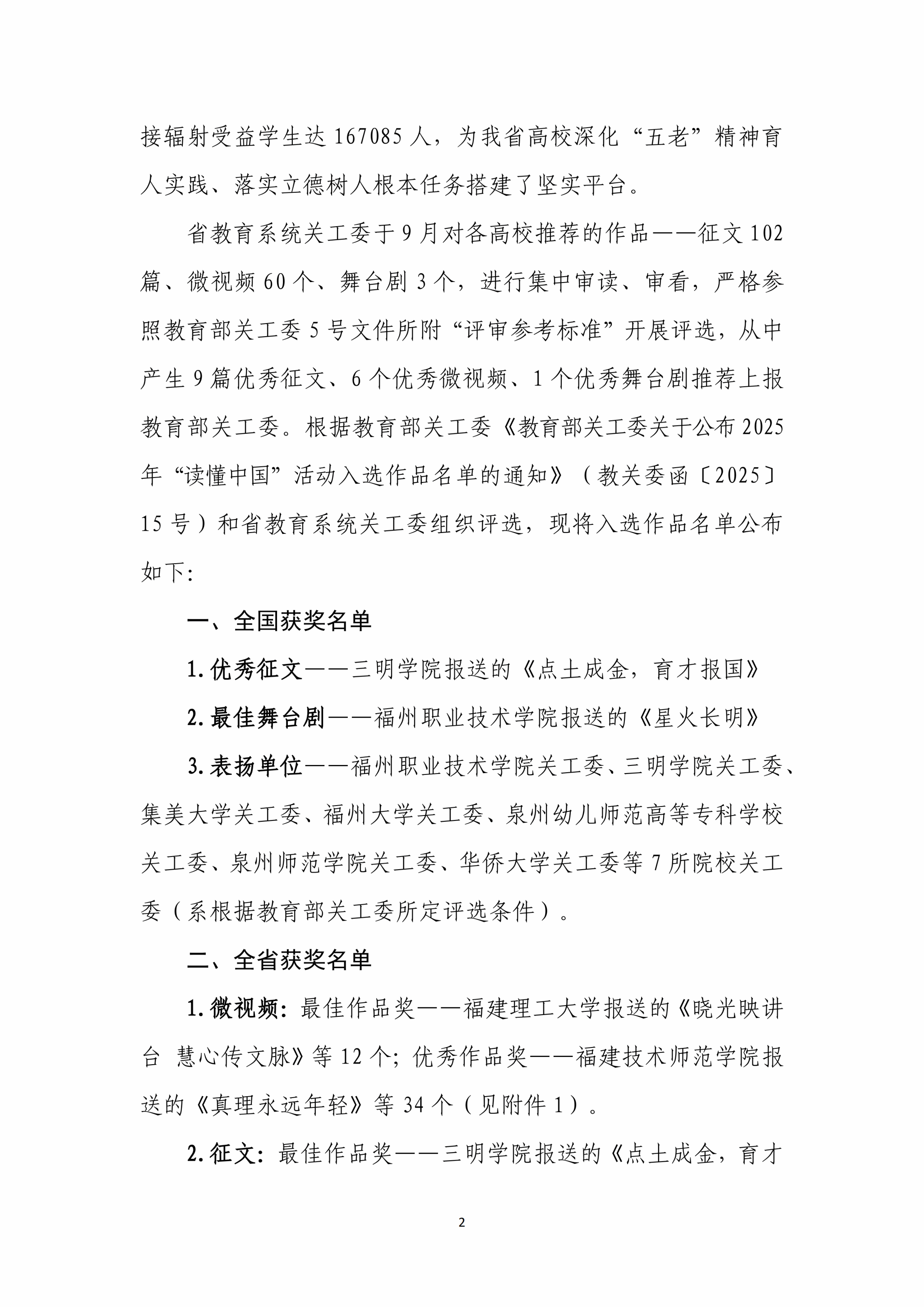 近日,福建省教育系统关心下一代工作委员会公布我省高校参加教育部关工委2025年“读懂中国”活动入选作品获奖名单。我校关工委荣获全省“优秀组织奖”,选送的两篇征文《忠诚的刻度:记两位“五老”的生命印记》《闽南风骨铸英魂》获评省“优秀作品奖”。