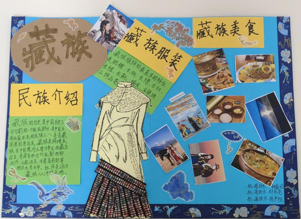 开展手抄报、海报设计、书法比赛等活动,以民族团结作品为主线,展现青年学子红心向党,团结奋进的精神面貌,强化了中华民族共同体意识。我校航海交通学院开展“中华民族一家亲,同心共筑中国梦”民族风情文创作品展,评选出9件优秀作品展出。通过插画、海报、服装效果图等方式展现民族风情。创作者积极向观览者讲解创作含义,科普民族特色文化。在展板前,观览的师生们驻足凝视、欣赏各民族特色文化风情,体会其作品的深刻内涵。