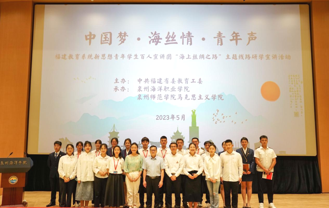 为深入学习宣传贯彻党的二十大精神,推动党的创新理论入脑入心,由中共福建省委教育工委主办,泉州海洋职业学院、泉州师范学院马克思主义学院联合承办的中国梦·海丝情·青年声——福建教育系统新思想青年学生百人宣讲团“海上丝绸之路”主题线路研学宣讲活动于5月17日在我校图书馆二楼学术报告厅隆重举行。