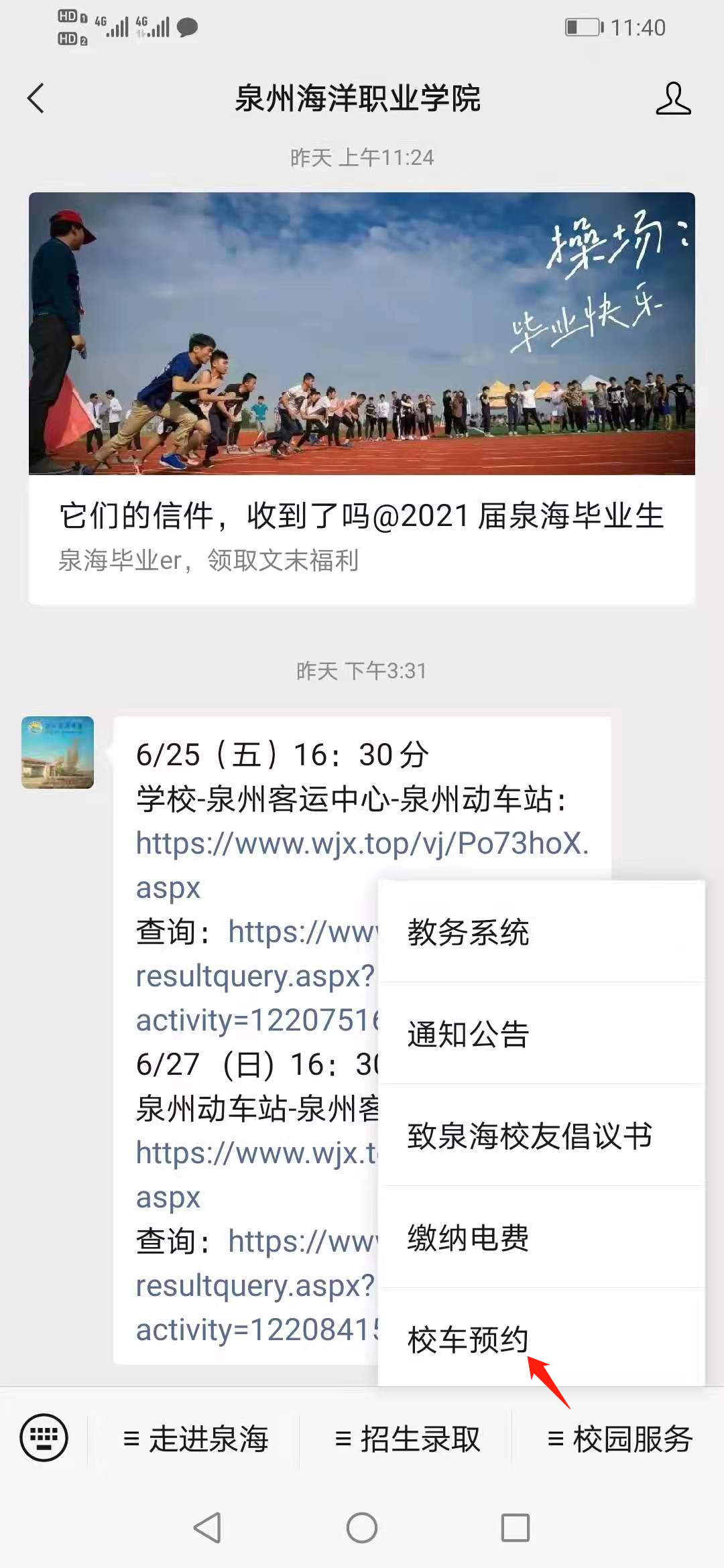 微信公众号关注“泉州海洋职业学院”,进入发送消息界面,在校园服务菜单栏内选择校车预约,点击相关链接并填写信息即可预约。