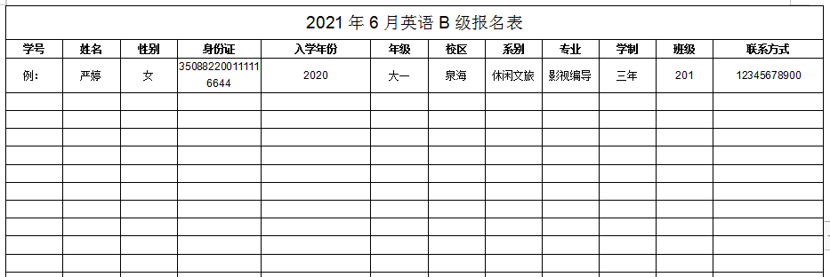 报名以班级为单位,各班负责人须认真审核本班同学的报名资格。请各班负责人让要报名的学生认真填写《英语B级考试报名表》(详见附件一),如因信息错误导致错过报名时间,其责任由学生本人自行承担。