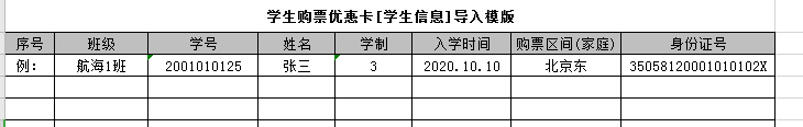 请于2020年10月20日-10月25日按照《学生购票优惠卡[学生信息]导入模版》登记本学年需要购买火车优惠磁卡的学生信息,购票区间由学校地址与学生家庭地址确定,学校地址默认站为泉州站,学生家庭地址需按照铁道部规定的学生家庭最近城市名称或火车站名称进行设定,否则,不能购买优惠火车票。