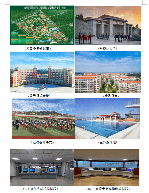 泉州海洋职业学院是一所经福建省人民政府批准、教育部备案的全日制普通高等院校,是福建省“双高计划”建设校。学校坐落于泉州湾南岸,依山面海,风景秀丽,占地1105亩,其中海边训练基地94亩,另有排他性海域 280亩,是全国唯一拥有独立码头、港湾、沙滩、岛屿的校海一体特色的高职院校,已建设投入使用面积超45万平方米,是一所具备“千亩万人”办学规模的滨海高校。以涉海专业为特色,以打造“本地离不开,业内都认同,国际能交流”的本科层次海洋职业大学为愿景,聚焦海洋经济和区域社会经济开设海洋工程类、交通运输类、智能制造类、经济管理类、艺术体育类、护理类、电子商务类等40个高职专业,其中航海技术专业群被列入省双高计划建设专业群,现有在校生18111人。具备经中华人民共和国海事局批准的含无限航区船长、轮机长、特种船等在内的24项船员培训资质,另具有海上交通安全技能培训资质,每年各类培训量超4.5万人次。航海技术、轮机工程技术学历教育和船员培训规模多年来位列全国前列。2021年学校以“优良”成绩通过交通运输部海事局航海教育培训质量评估。