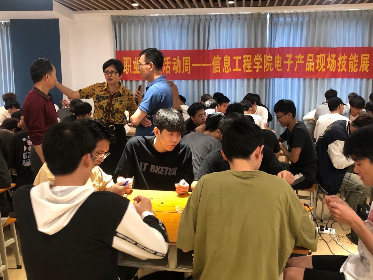 5月15日,在信息工程学院电子产品现场技能展中,我院学生在专业教师的指导下展示了电路板焊接以及电子产品的装配与调试等操作,许多师生纷纷上前参观体验,现场热闹非凡。通过本次活动,提高并锻炼我院学子的专业技术,展示职业教育服务地方经济社会发展的魅力,使“劳动光荣、技能宝贵、创造伟大”的时代风貌更加凸显,从而营造全社会支持、关注、重视职业教育发展的良好氛围。