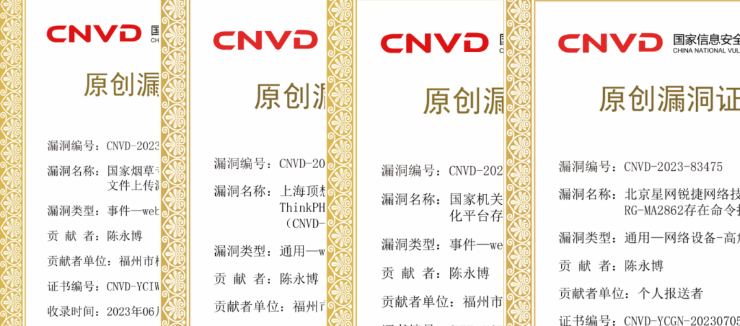 此外,他还积极参与教育漏洞报送平台工作,凭借敏锐的技术洞察力和扎实的专业功底,成功发现并报告了多个高危安全漏洞,为教育系统的网络安全做出了积极贡献。在此过程中,他不仅荣获了教育漏洞报送平台授予的“网络安全专家”称号,还因在多所高校的漏洞报送工作中表现出色,获得了多家高校颁发的荣誉证书。