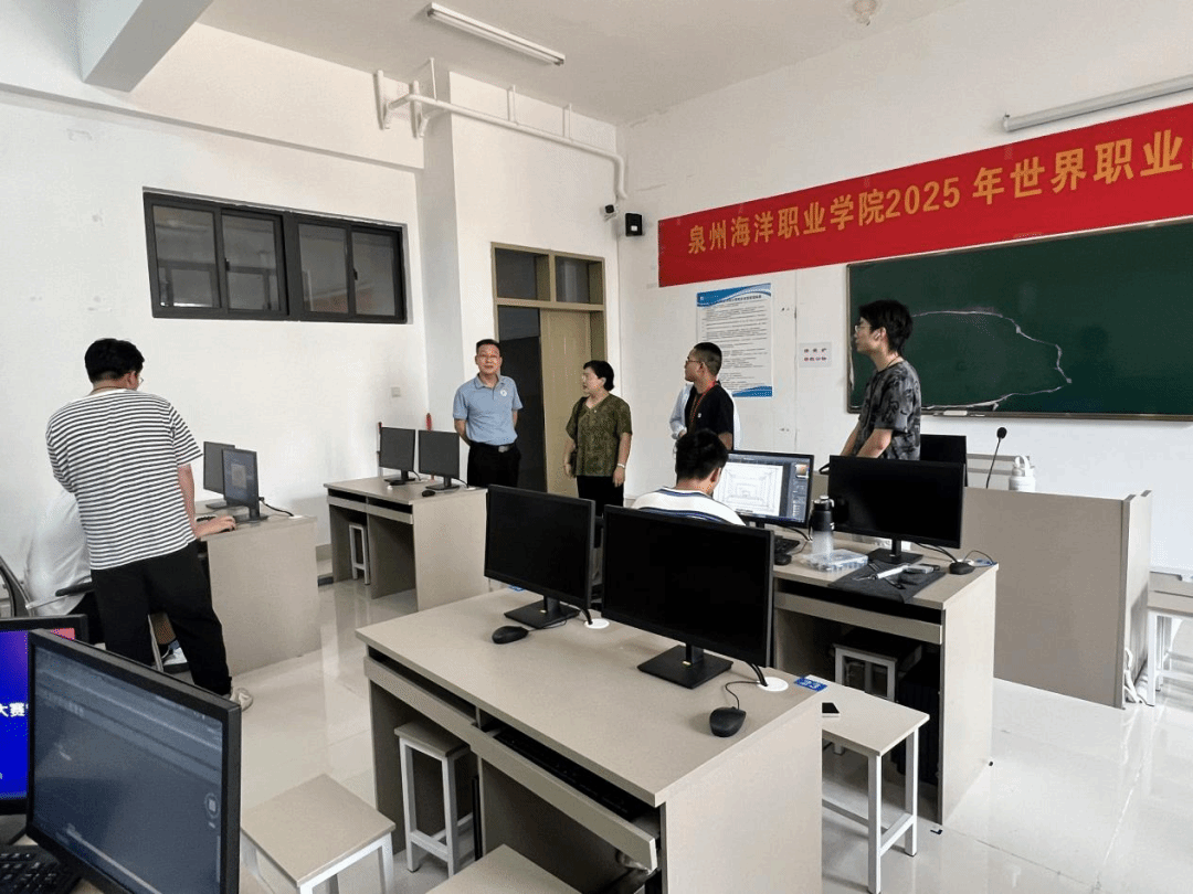 2025年7月7日,泉州海洋职业学院常务副校长唐学学带队前往教学实训楼1410教室看望信息工程学院正在全力备战2025年世界职业院校技能大赛的师生团队。泉州海洋职业学院教务处副处长廖贵强、信息工程学院院长贾超、副院长曹金香相陪同,为参赛师生送去学校的关怀与鼓励。
